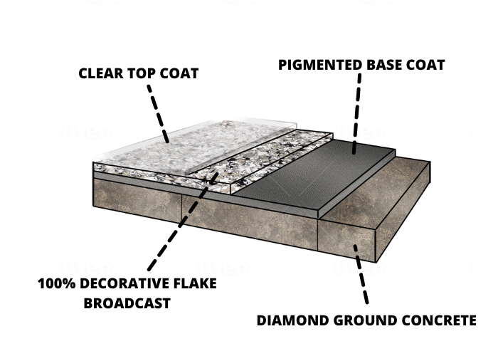 Polymer-based flakes are then broadcast across the floor using 3x as much flakes as required to ensure all areas are covered generously and evenly.