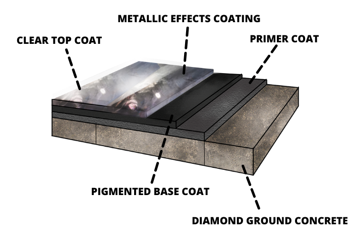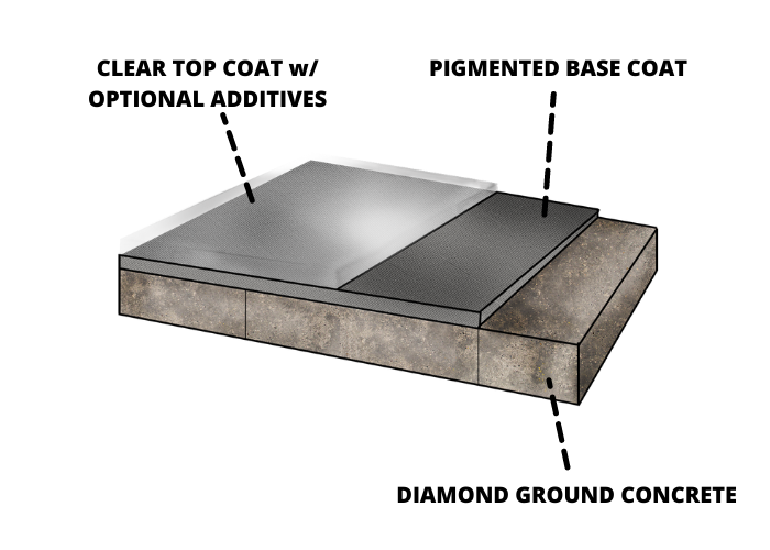 We apply an Epoxy base coat system. This coating is flexible after it dries. Once poured, it will seep into the pores of the concrete's surface, creating roots when fully cured. The best option on the market